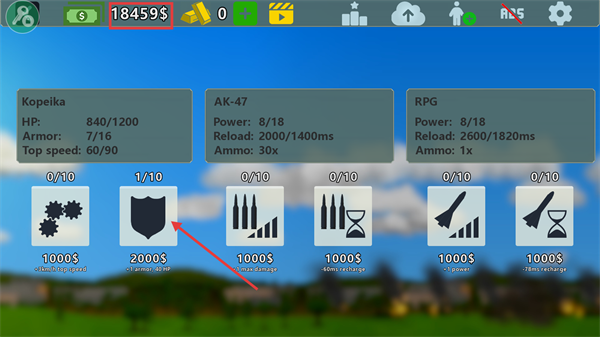 2、在升级界面消耗【18459$】,点击盾牌图标提升防御,也可升级武器增强战力。