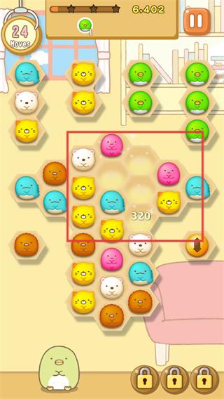 1、消除方块后出现【320】得分提示,【MOVES】剩余24步,得分提升至【6.402】,继续组合相同形象方块。
