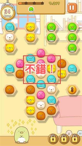 2、触发消除后出现【不錯!】提示,得分升至【7.217】,【MOVES】仍为24步,优先消除密集相同形象区域。