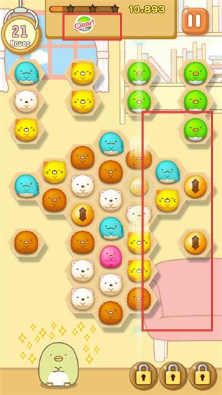 4、出现【Clear!】提示,得分达【10.893】,【MOVES】剩21步,消除右侧区域方块完成当前阶段目标。