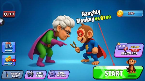 1、在游戏主界面点击【START】按钮,进入【Naughty-Monkey-vs-Gran】的关卡场景,开启任务挑战。