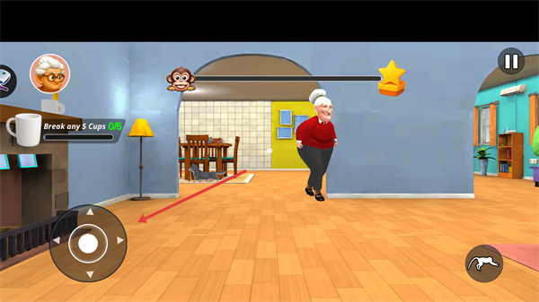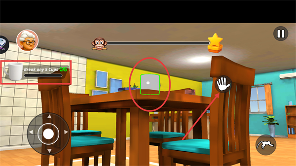 2、进入关卡后,通过左侧方向控制按钮操控角色移动,目标是完成【Break-any-5-Cups】的任务。