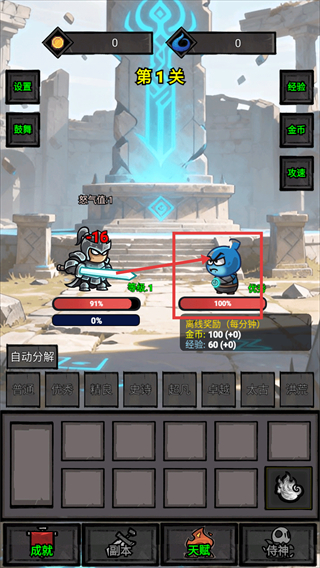 1、进入【第1关】后,关注敌方(优秀品质)的状态条,同时利用离线奖励(每分钟金币-100、经验-60)积累资源。
