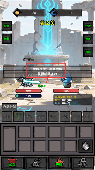 2、达成【成就达成·装备成就】后可获得新装备,升级至【等级-2】时,离线奖励会随关卡提升而增加。