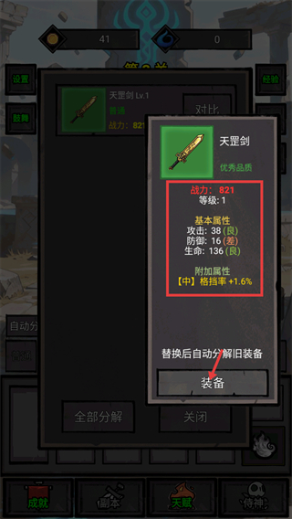 3、获取【天罡剑-Lv.1】(优秀品质)后,查看其属性(攻击-38、防御-16等),点击【装备】替换旧装提升战力。