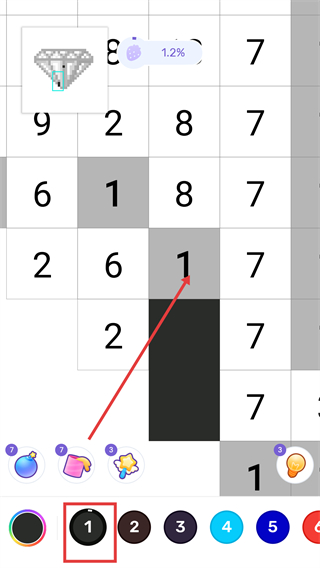 2、选【1号】黑色色块,沿【红色箭头】填充数字1的格子,开始绘制钻石轮廓。