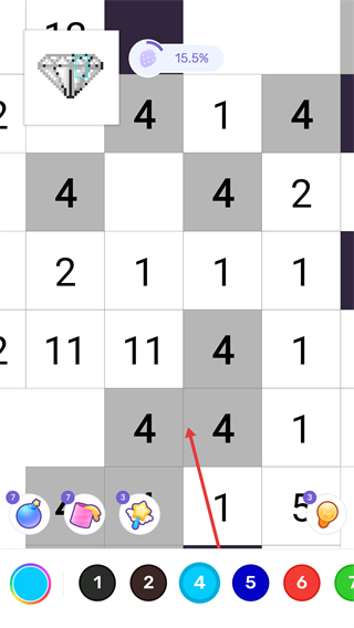 3、沿【红色箭头】填充数字4的格子,切换对应色块完善钻石主体结构。