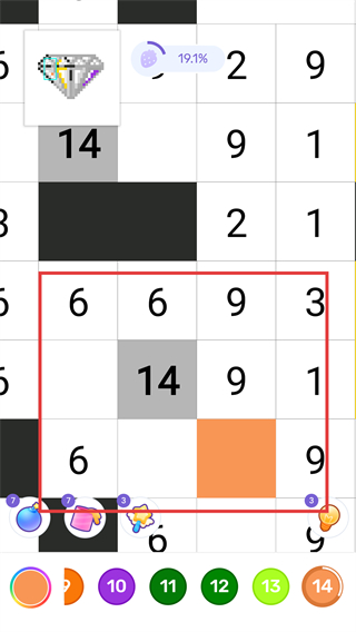 4、选中【14号】色块,填充【红色框】内数字14的格子,细化钻石细节部分。