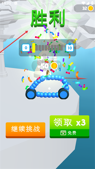4、达成【胜利】后可获得【+50-金币】奖励,选择【继续挑战】开启下一局,或选【领取x3】看广告得三倍奖励。