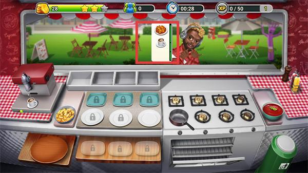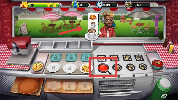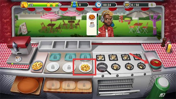 4、搭配好食材后,使用【煎锅】等烹饪工具加工餐品,完成后将餐品递送给对应顾客获取奖励。