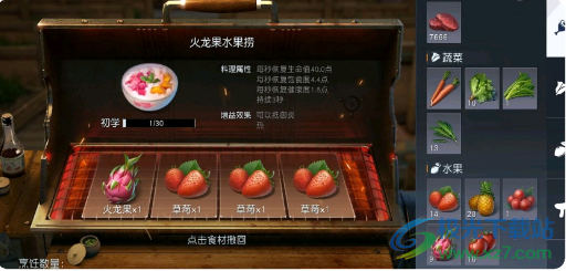 2、解锁防护服后,我们在采集地图资源最好多准备一些火龙果料理,来降低炎热,配方给大家贴上啦。