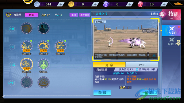 4、雷神之弓:使用魔法弓箭,引导紫雷化为箭矢,向前方射出三根雷。可充能2次。