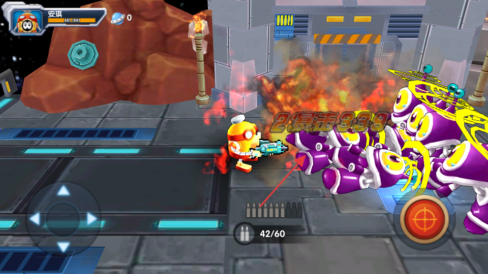 3、遇到敌人时,点击射击键等对应按钮进行攻击,如箭头所指,瞄准并攻击紫色敌人,开启冒险战斗。