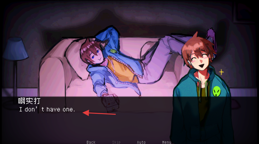 3、剧情对话中遇到选项,如“Idon’thaveone.”,根据喜好选择,推动剧情发展。