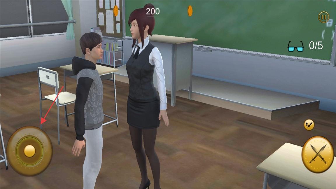1、在教室场景中,利用左下角移动按钮控制角色移动,与人物互动,注意收集上方显示的金币和道具。