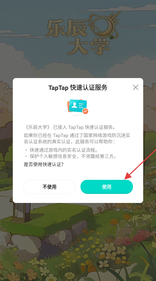 2、遇到【TapTap快速认证服务】弹窗,若已在TapTap完成实名认证,点击【使用】,可快速通过游戏实名认证。