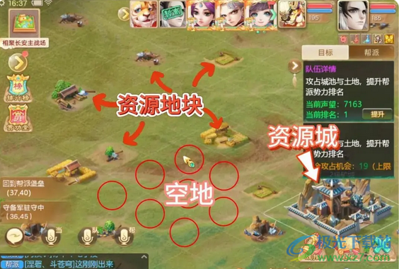 4、地块驻守:每个地块最多可驻守三支队伍,驻守地块后,可以增加该地块的资源产量。