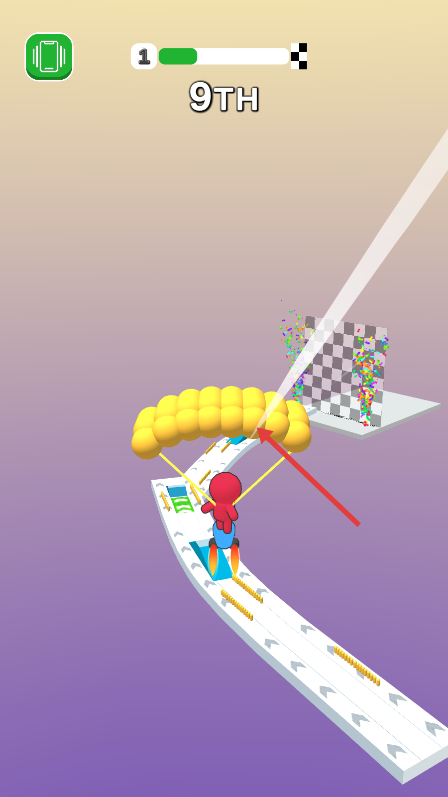 2、遇到绿色的加速带时,利用其加速效果,快速超越其他对手,也可以利用滑翔伞机制,冲出赛道,直接飘向终点。