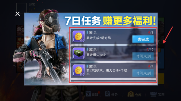 1、进入游戏界面,我们可以看到【7日任务】的内容,完成可以获得丰厚奖励,在对局中我们尽量完成这些任务吧。