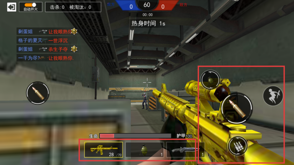 4、进入战斗后,我们有10秒的时间来热身,趁着这会快速熟悉一下操作吧,滑动左下方区域移动角色,点击下方武器栏可以切换武器,点击右侧按键可以进行射击、跳跃、装弹、瞄准,细致的操作按键能让你在这沉浸式的环境中大展身手。