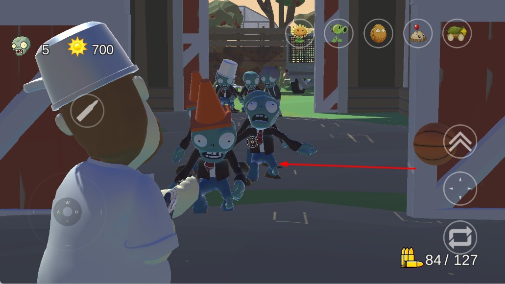 3、遭遇僵尸潮,移动瞄准,射击僵尸,利用植物辅助,减少自身压力。