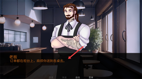 4、进入餐厅场景后,依据老板的指示,执行将柜台订单配送至对应餐桌的任务,继续推进游戏流程。