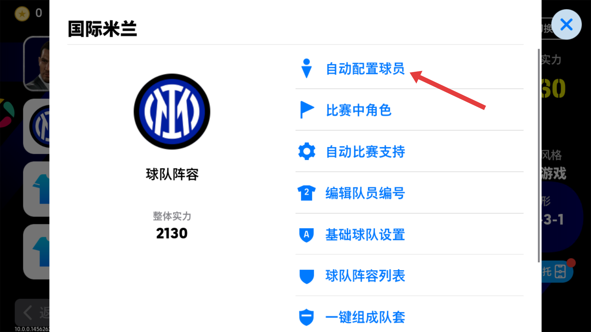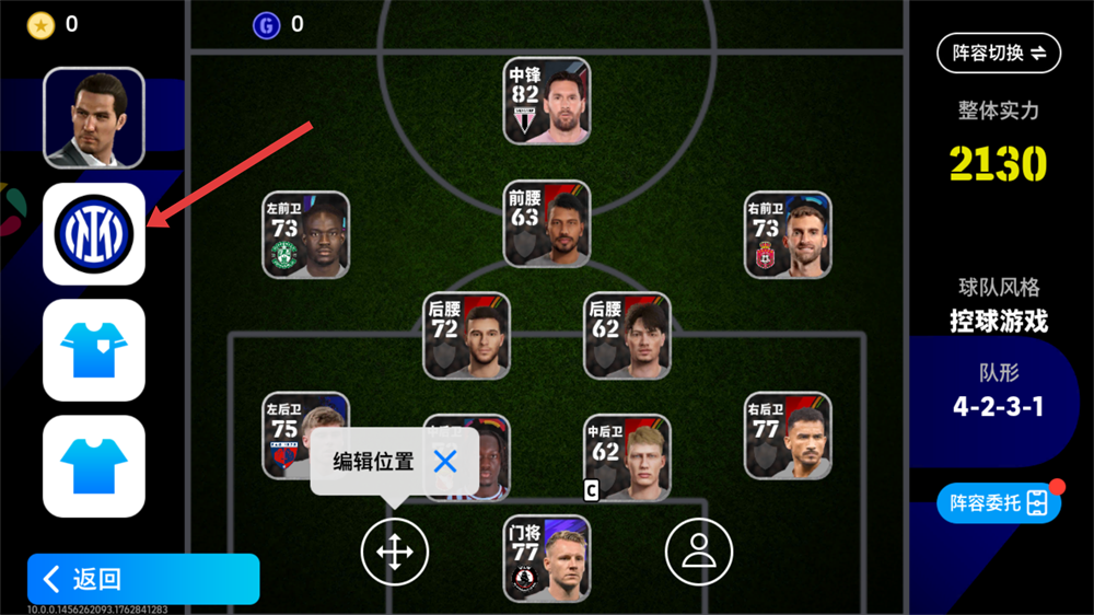 1、选择【国际米兰】队打造阵容,根据战术需求编辑球员位置,搭建出适配控球游戏风格的4-2-3-1阵型哦。