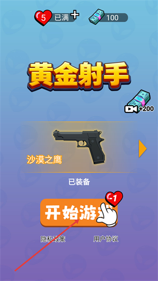 1、在【黄金射手】主界面,确认已装备【沙漠之鹰】后,点击【开始游戏】(消耗1点爱心),即可进入关卡。
