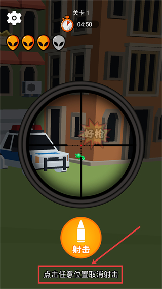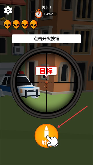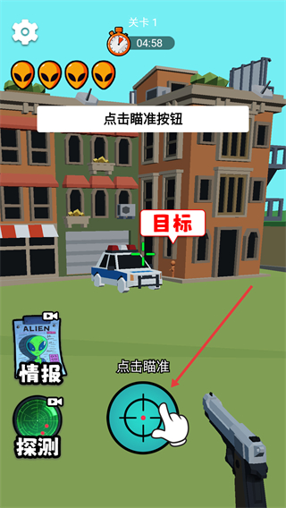 2、进入【关卡1】后,根据提示点击【瞄准】按钮,可锁定标注“目标”的对象,为射击做准备。