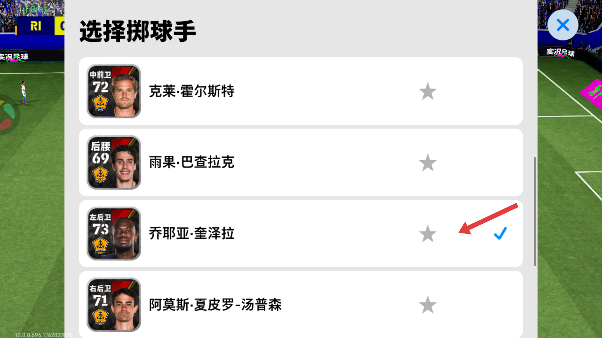 2、在【选择掷球手】界面,优先选择像【乔耶亚】这类能力值较高的左后卫,利用其掷球精度,为球队创造进攻机会。