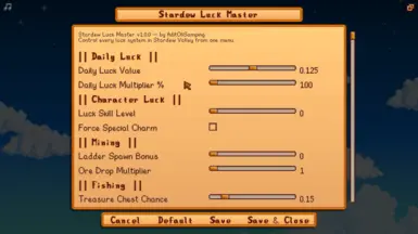 《星露谷物语》星露之幸运大师MOD。再也没有倒霉的日子了!在游戏内的配置菜单中,完全掌控每日幸运、矿石掉落、钓鱼宝藏和晶洞奖励。感兴趣的玩家快来diab暗黑下载吧!