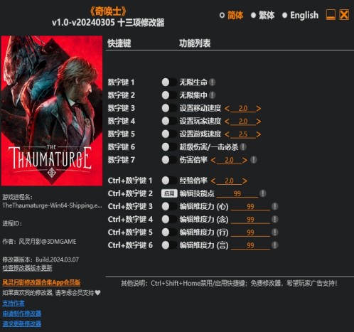 《奇唤士修改器风灵月影版》是一款针对同名游戏“奇唤士”改变制作上线的修改器风灵月影版,在这款游戏上面能够让你体验动作游戏带来的快乐,更是在游戏当中设定了超多的种族文化,能够让各位玩家们以玩游戏的方式来感受多种不同的文化,更是在游戏当中设定了超多精彩的剧情,这些剧情内容可以让你自由培养上面的角色,还有很多神秘生物能够让你自由的发起挑战,还可以将它们收服哦,这次小编带来的修改器风灵月影版更是能够让玩家们上线就获得无限生命、无限集中、设置玩家速度、设置游戏速度、一击必杀等十三项功能,非常强大,有喜欢的小伙伴们快来下载试试吧。