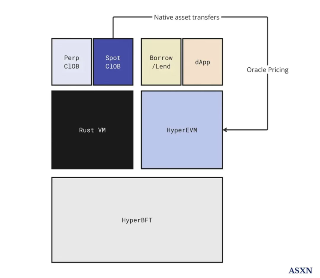 它并非一条独立的链,而是由与 HyperCore 相同的 HyperBFT 共识机制保障安全。两者共享状态,并且本质上使用了不含 Blob 的 Cancun 硬分叉版本。