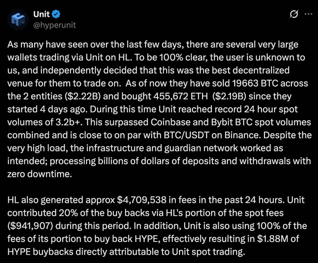 Unit 专案透过提供更原生的现货交易体验,有力地推动了 HIP-2 的採用。本质上,Unit 是一个多签钱包,它允许交易者索引原生链并在 Hyperliquid 上进行无需许可的交易。