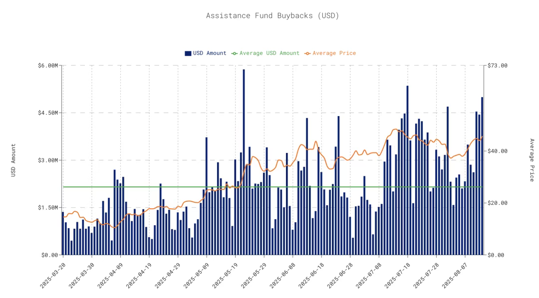 Assistance fund 主导的回购计画显示,目前已累计回购 2800 万枚 HYPE,资金来源于总收入的 54%(永续合约费用的 46% 分配给了 HLP 存款者,这意味着 92–97% 的总收入都返还给了用户),平均每日回购金额达 215 万美元。