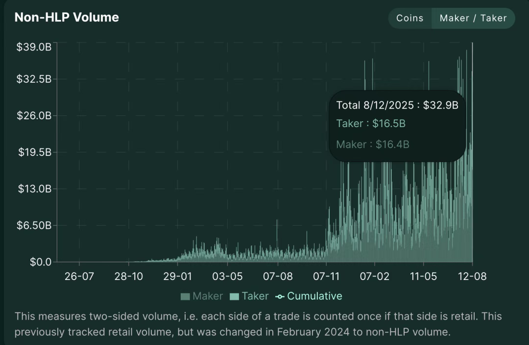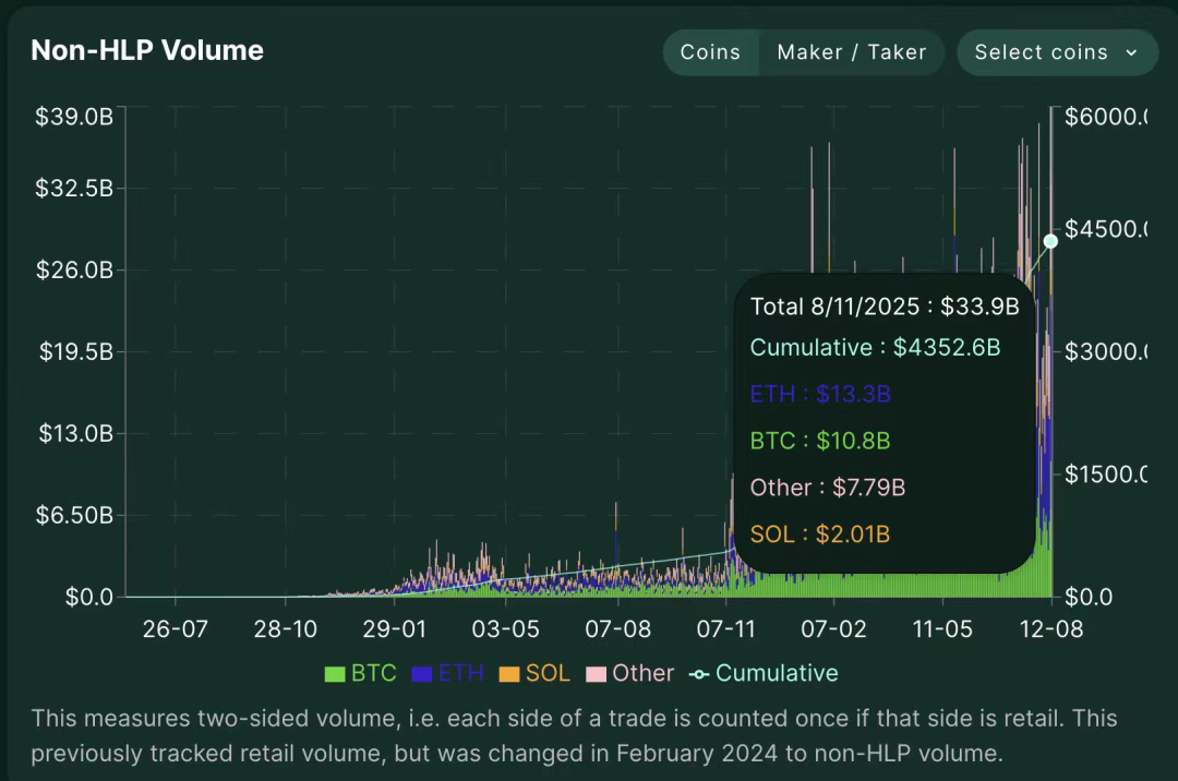 採用非 HLP 交易量指标(累计 4.3 兆美元)来分析,由于 HLP 是被动流动性提供者/平台资金池,负责内部化订流和对沖风险,因此非 HLP 交易量代表了用户对用户(Peer-to-Peer)的交易流。需要留意的是,这部分用户间交易流仍包括: