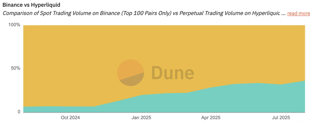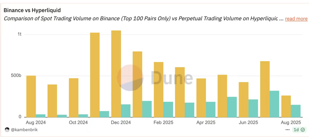 然而,将现货交易量与永续合约交易量直接比较,就像比较苹果和橘子。如果我们想要清晰区分币安(Binance)和 Hyperliquid(HL)在现货与永续合约市场的实际份额,可以看到以下情况:
