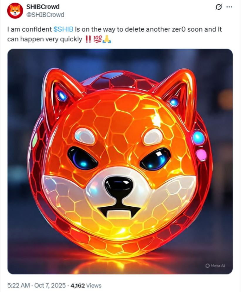 柴犬币(SHIB)看涨情绪升温,投资者预期价格将快速突破并再减一个零。来源:SHIBCrowd via X