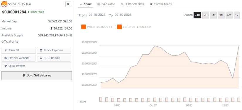 本文撰写时SHIB报0.00001284美元,24小时涨幅3.02%。来源:Brave New Coin