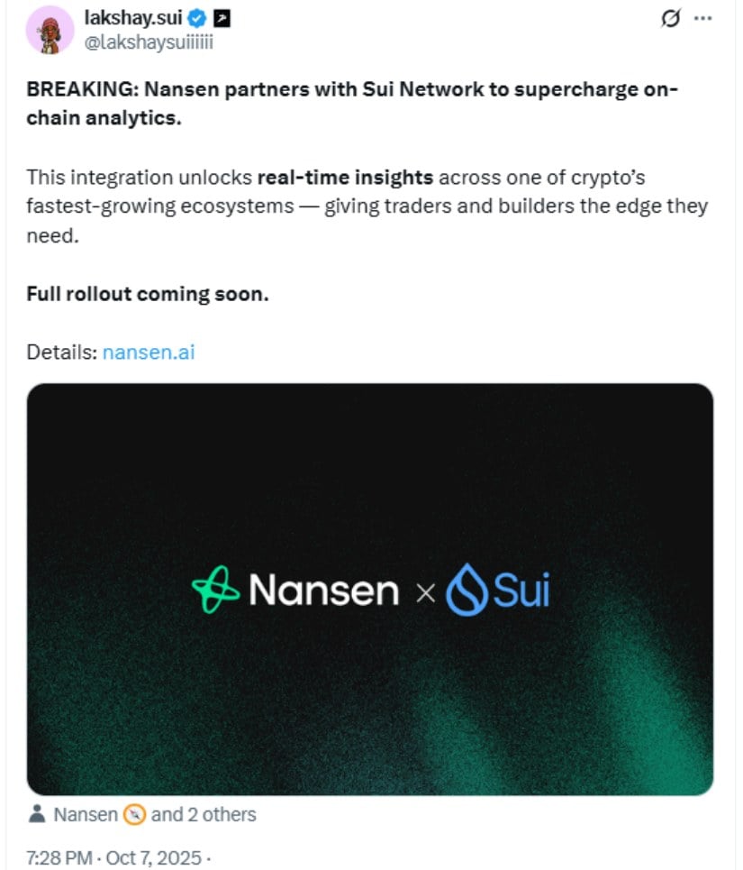 突发:Nansen已与Sui Network达成合作强化链上分析,为快速发展的Sui生态中交易者和建设者提供实时洞察。来源:lakshay.sui via X