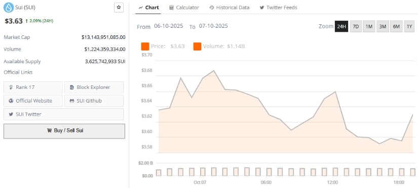 截至发稿,Sui报价3.63美元,24小时上涨2.09%。来源:Brave New Coin