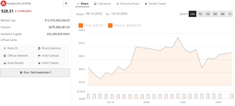 AVAX现价28.31美元,24小时微跌0.15%。数据来源:Brave New Coin