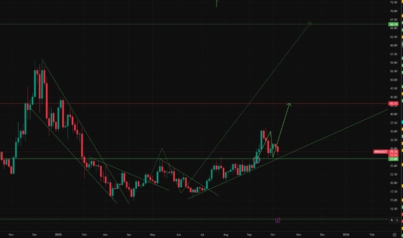 Vuori预测本周期价格将达三位数。虽显激进,但该观点基于坚实依据:高周期支撑、RSI回升及历史相似形态突破规律。短期38美元仍是关键阻力,但整体结构暗示Avalanche正为更远大目标奠基。守住31美元对维持看涨逻辑至关重要。