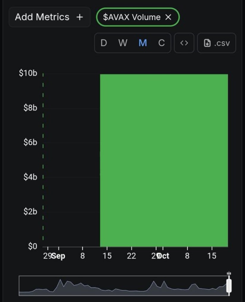 Avalanche链上10日交易量突破100亿美元,凸显强劲流动性及巨鲸参与。数据来源:Marc Shawn Brown via X