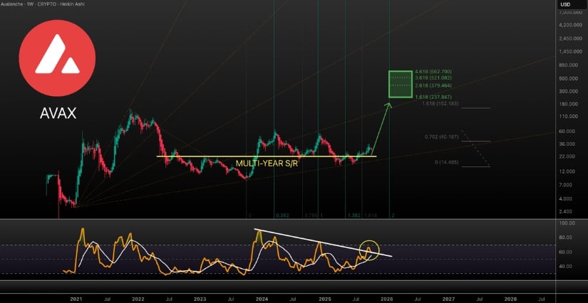 AVAX坚守多年关键区域,RSI发出突破信号,本周期目标位看至三位数。数据来源:Vuori via X