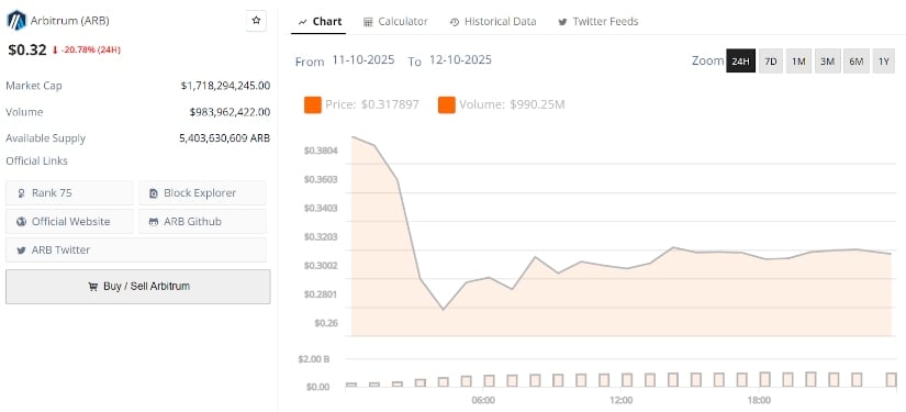 Arbitrum当前价格为0.32美元,24小时下跌20.78%。数据来源:Brave New Coin