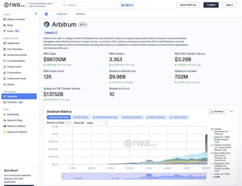 Arbitrum正成为最活跃的加密结算层之一,处理32.9亿美元现实资产(RWA)转移及近100亿美元稳定币交易量。这表明尽管价格波动,网络效用仍在快速扩张。