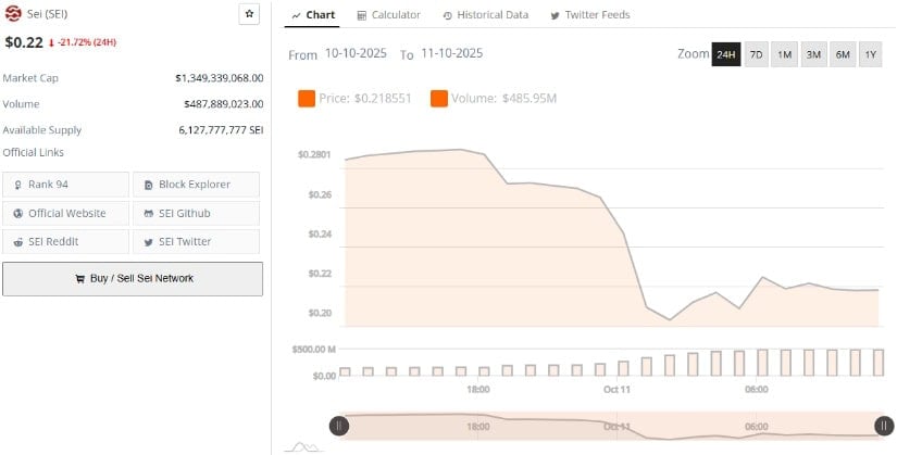 BraveNewCoin数据显示,SEI现报0.22美元附近,24小时跌幅达21.7%。此次修正发生在数周波动加剧之后,交易者正消化突破信号并适应市场动态变化。尽管出现回调,该代币市值仍保持在13.4亿美元高位,日交易量4.87亿美元表明获利了结中市场参与度依然活跃。