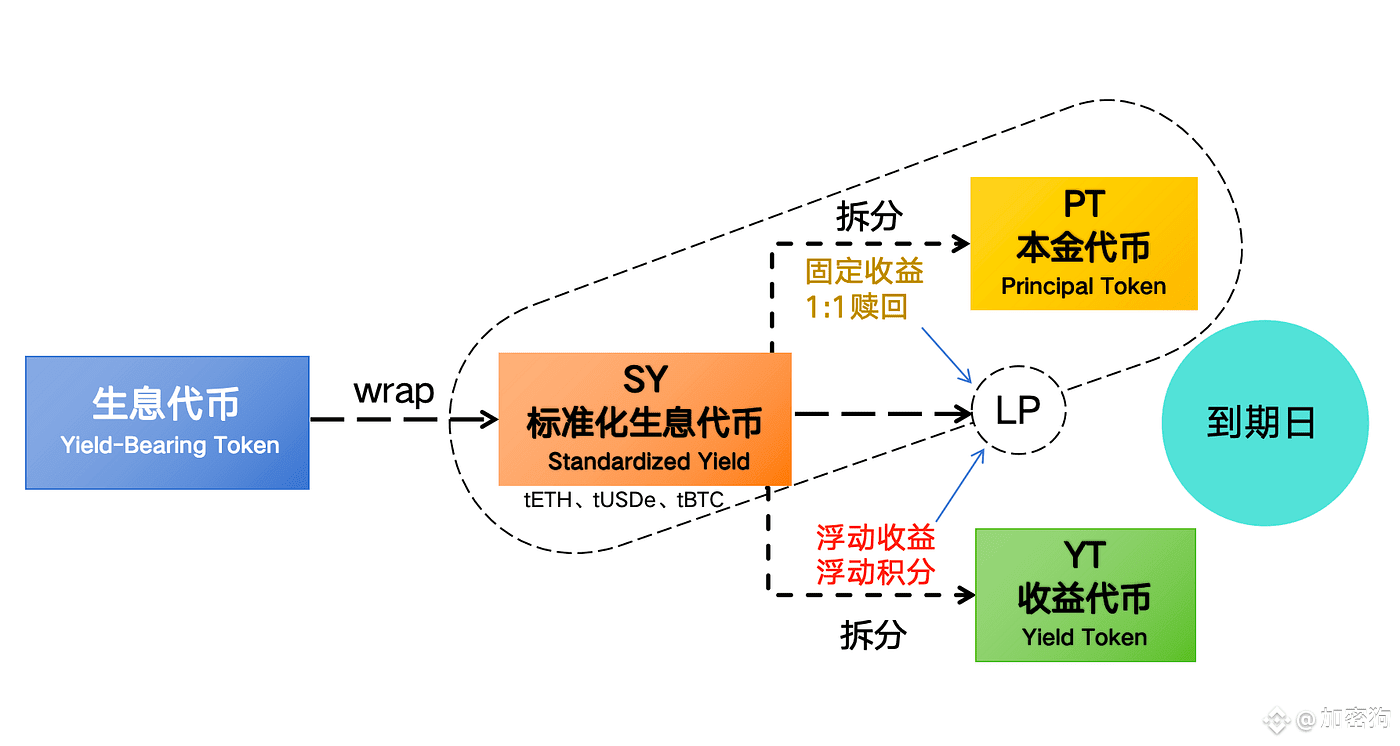 简单来说Pendle 有四大核心概念:SY(标准化生息资产)、PT(本金代币)、YT(收益代币)、LP(流动性提供者头寸),关系图如下: