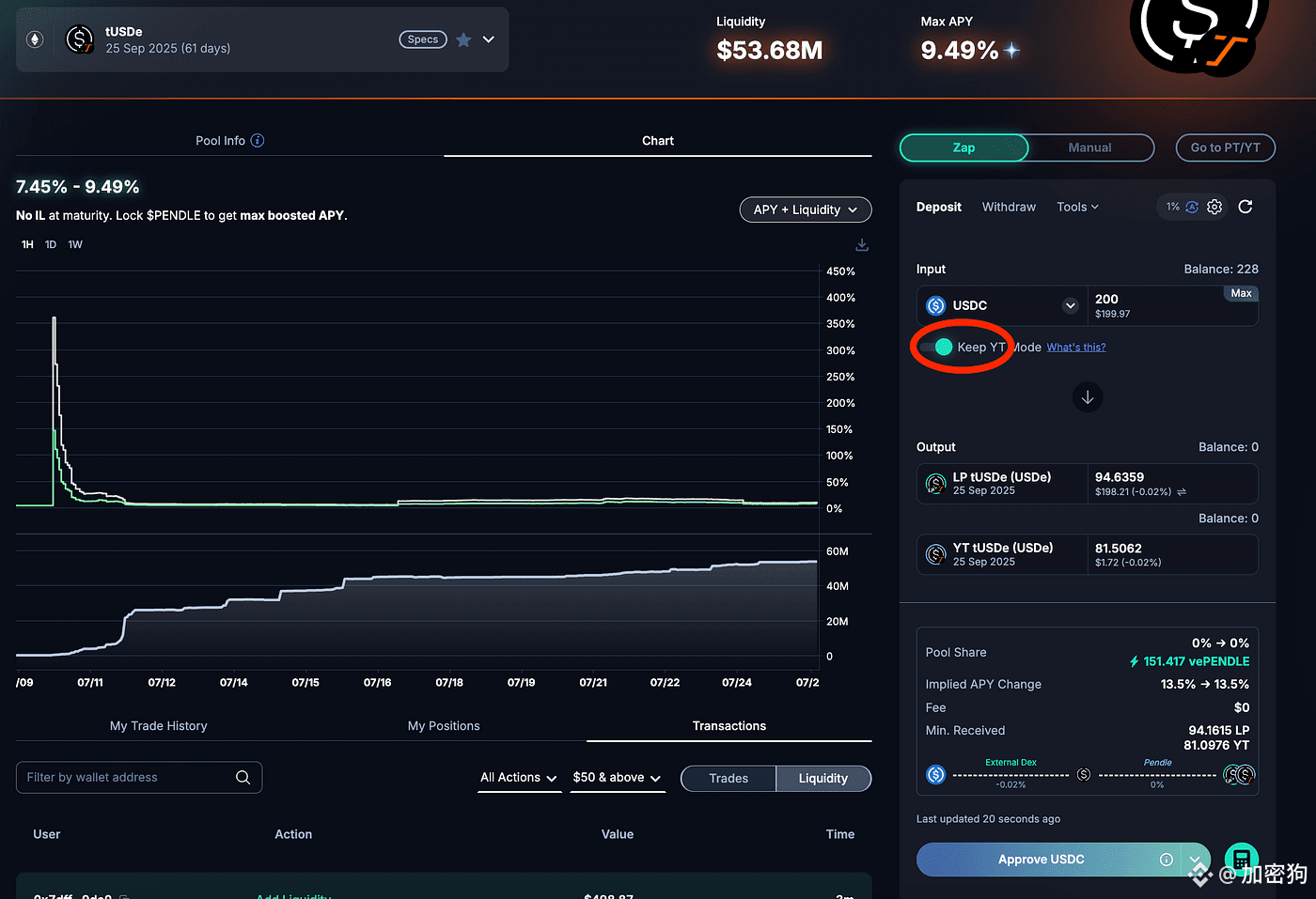 也就是说不开“Keep YT Mode”,就不保留组建LP过程中铸造出来的YT并在市场卖掉,出售YT的资金用来组成更多LP单位。 适合轻微看空“鸡蛋”收益,或不想持有 YT、专注于 LP 收益,追求 LP 的“纯净持仓”,不想额外管理 YT的玩家。
